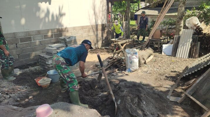 Glagah – Semangat gotong royong kembali terlihat di Desa Tamansuruh, Kecamatan Glagah. Babinsa Koramil 0825-03/Glagah, Serma Supiyanto, bersama beberapa anggota TNI lainnya dan warga sekitar, berjibaku melaksanakan kegiatan bedah rumah program Rutilahu Tahun Anggaran 2025 milik Ibu Suwasanah, warga Dusun Mondoluko, Sabtu (11/10/2025).