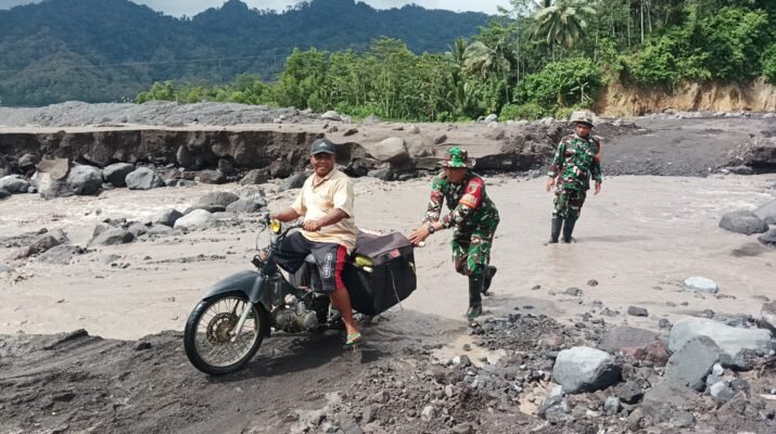 Lumajang – Di tengah cuaca yang tidak menentu dan aktivitas lahar dingin yang masih terjadi pasca-erupsi Gunung Semeru, Personel TNI kembali menunjukkan komitmen kemanusiaan