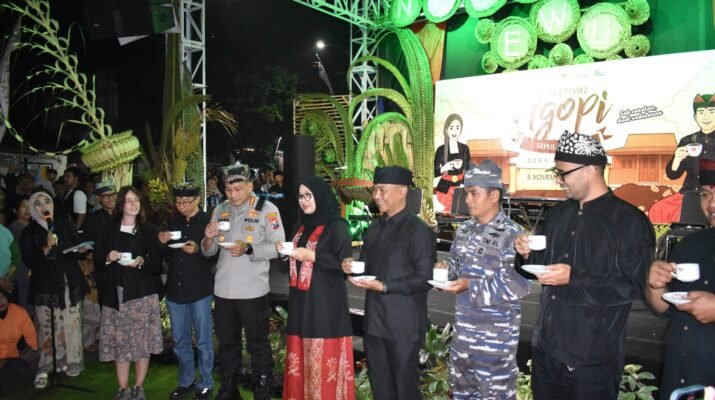 BANYUWANGI — Aroma kopi semerbak menyelimuti udara Desa Kemiren, Kecamatan Glagah, Banyuwangi, Sabtu malam (8/11/2025). Ribuan warga tumpah ruah di jalan utama desa adat