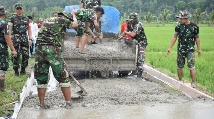 Pekerjaan pengecoran jalan ini dilakukan secara bergotong royong antara anggota Satgas TMMD dengan warga setempat. Semangat kebersamaan dan kekompakan terlihat jelas di lapangan. Para prajurit TNI dan masyarakat bahu-membahu mengaduk semen, mengangkut material, serta meratakan cor di sepanjang jalan yang menjadi akses utama bagi para petani.
