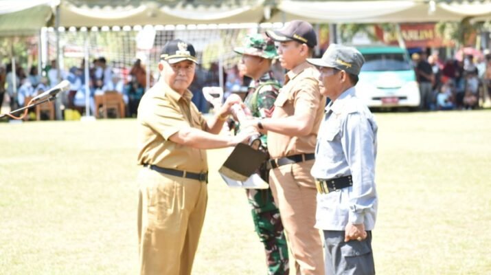 Malang – Bupati Malang, H. M. Sanusi secara simbolis menyerahkan alat kerja kepada para anggota TNI Manunggal Membangun Desa (TMMD) ke-126 Kodim 0818/Malang-Batu. Kegiatan tersebut berlangsung di Lapangan Desa Lebak Harjo, Kecamatan Ampelgading, Kabupaten Malang, pada Rabu (8/10/2025).