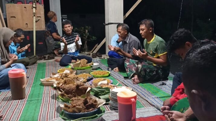 ‎Usai doa, warga saling berbagi hidangan yang dibawa dari rumah masing-masing. Suasana hangat dan akrab mencerminkan kuatnya rasa gotong royong yang terjalin antara warga dan prajurit TNI.
